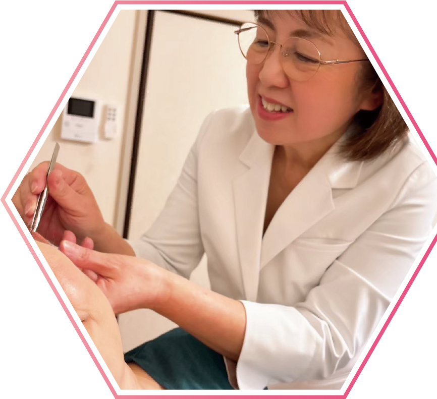 専用の医療用の肌色のガーゼテープで貼って、刺激していきます。針ではないので、